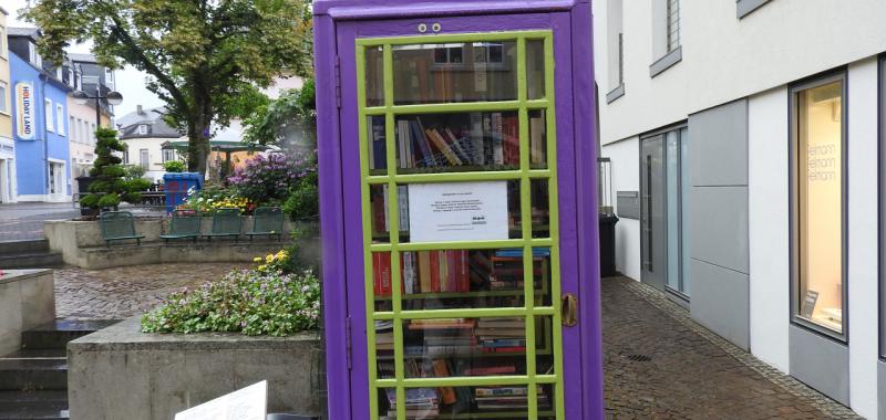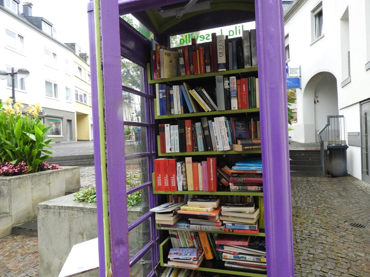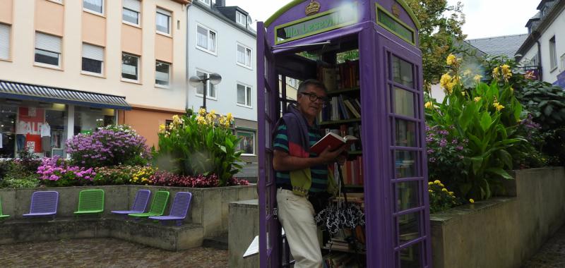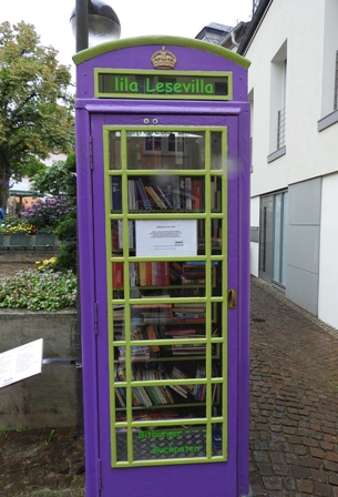 Buscando el consabido restaurante, mi amigo alemán Horst, cabecilla del grupo de amigos en aquellas tierras, ya que es de Freiburg y se conocía bien la zona, nos dijo que iba a enseñarnos algo realmente insólito. ¡La biblioteca municipal más pequeña del mundo! Y así fue, en una de las plazas de la población de Bitburg se encontraba una cabina de teléfonos morada llena de libros a rebosar, incluso había unos pocos bancos para poder leer quien quisiese y tuviese tiempo.