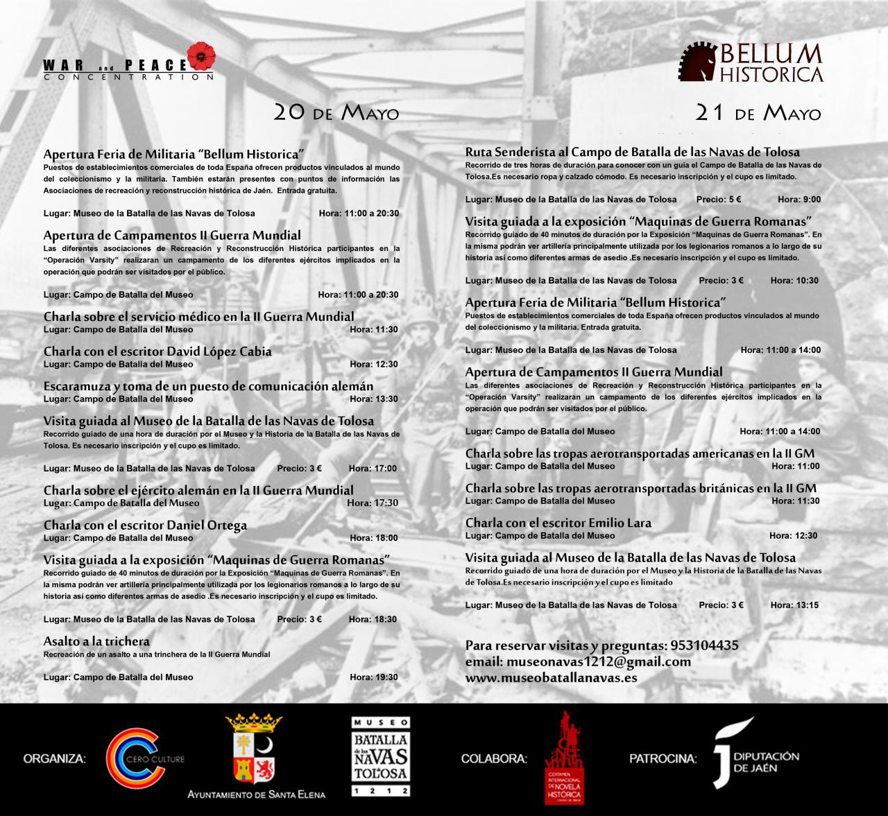En el Museo de la Batalla de las Navas de Tolosa (Santa Elena), los próximos 20 y 21 de mayo tendrá lugar la primera edición de “Bellum Histórica”. Este encuentro de recreadores y coleccionistas tiene un programa compuesto por diferentes apartados que llenarán el fin de semana de actividades dirigidas, sobre todo, a profundizar en el conocimiento de un conflicto bélico más reciente del pasado siglo como es la Segunda Guerra Mundial (1939-1945), no sólo evocando su desarrollo sino también como hilo conductor para trasmitir un mensaje de reflexión y tolerancia muy necesario en el mundo actual.