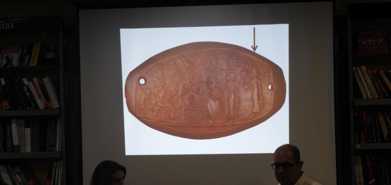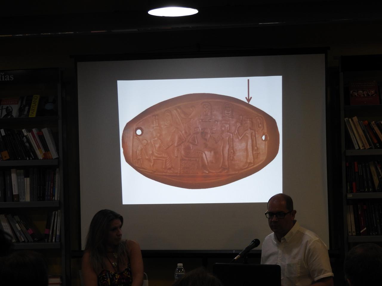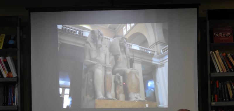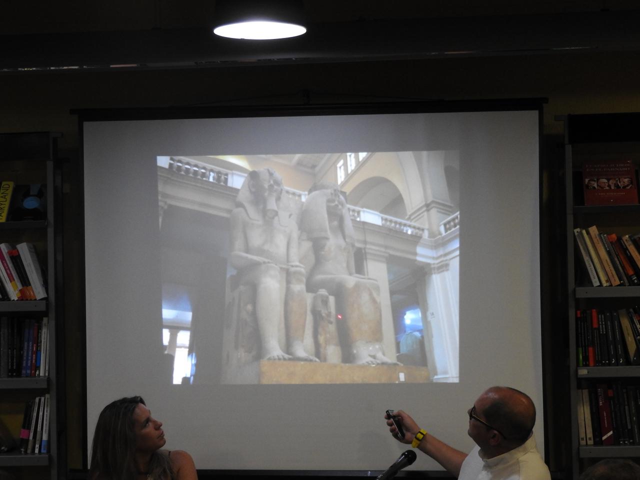 Nacho se apoyó en diapositivas para ir desentrañando el mundo de su novela y de Egipto. Nos fue mostrando planos, esculturas, edificaciones de ese Egipto milenario y nos explicó el porqué del cambio de religión y de capital en el país de los Faraones de hace cuatro cuatro milenios, más o menos. “Tebas, probablemente por la peste, no era un lugar muy recomendable y Akhenatón decidió llevarse la capital a Amarma. Así, desactivó el poder que tenían los sacerdotes de la época. También quiso dar un giro a las divinidades egipcias para hacer un culto monoteísta influido por las divinidades solares”, explicó con claridad meridiana.