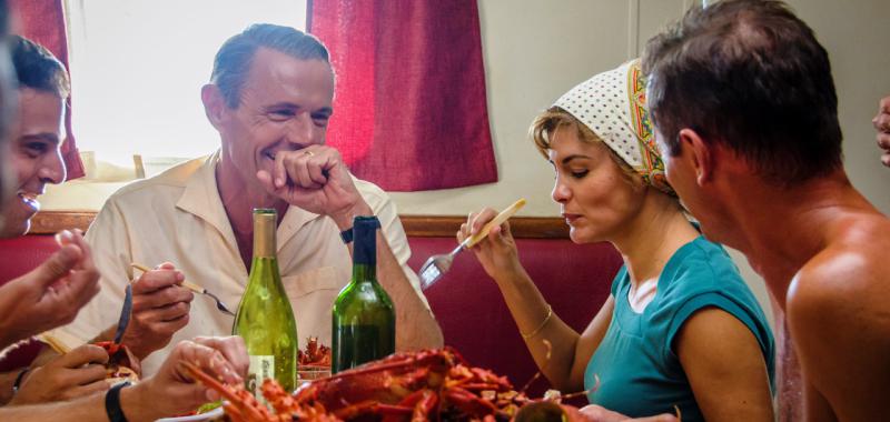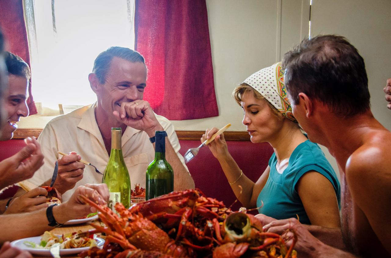 Jacques-Yves Cousteau (Lambert Wilson); Philippe Cousteau (Pierre Niney); Simone Cousteau (Audrey Tautou); Philippe Tailliez (Laurent Lucas); Jean-Michel Cousteau (Benjamin Lavernhe); Albert « Bebert » Falco (Vincent Heneine), Etienne Deshaies (Thibault de Montalembert), Daddy (Roger Van Hool); Jan (Chloé Hirschman); David Wolper (Adam Neill); Frédéric Dumas (Olivier Galfione); Henri Plé (Martin Loizillon); Philippe Cousteau (de niño) (Ulysse Stein); Jean-Michel Cousteau (de niño) (Rafaël de Ferran); Eugénie Clark (Chloé Williams)