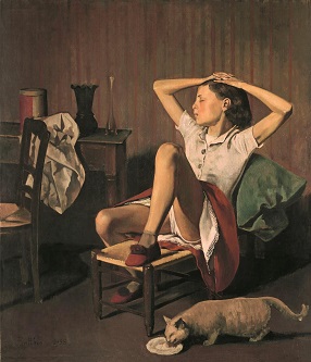 Atrapado por la necesidad de explorarse a través de otros, buscó refugio en artistas más clásicos como son, por ejemplo: Piero della Francesca o Caravaggio; o en obras literarias como Cumbres borrascosas de Emily Brönte donde indagó sobre la figura del señor Heathcliff. Su pintura es esencialmente vertical —si nos atenemos a composiciones como La calle— como los espacios que recorren algunos de sus figurantes que parecen ausentes del resto del mundo que les rodea. Esa especie de mimetismo se resuelve por la expresión de los ojos y el cuerpo, lo que funde la primaria condición de autómatas a sus personajes, para convertirlos en inocentes figuras de soledad. El objetivo de la narrativa pictórica de Balthus es sencilla: acompañar a su pensamiento, porque para él, la pintura lo es todo; una totalidad que abarca desde la preparación de las pinturas hasta la concepción nada circunstancial de sus cuadros, que siempre buscan la incertidumbre que provocan las emociones primarias. Como se suele decir en numerosas ocasiones, a veces lo menos es más, y sus retratos incrustados sobre fondos planos —la mayoría de las veces— así lo atestiguan. En este sentido, su poder no reside en las cercanías, sino más bien en el propio protagonista de sus pinturas. De ese modo sus figuras, casi geométricas y embutidas en perfectos cilindros, conos o trapecios, se rebelan frente al observador cuando le invitan a centrar su atención en un gesto o un objeto en principio secundario, pero que, sin embargo, es la fuente primaria de ese desasosiego tan presente en sus pintura. Algo que, por ejemplo, le ocurre al cuchillo hincado en el pan en Muchacha en verde y rojo. O a la ingenua postura de Thérèse soñando, cuando nos deja entreve su ropa interior, blanca como la luz que la alumbra e inocente como sus sueños. Ese foco de atención, no obstante, no siempre se circunscribe al solitario protagonista del cuadro, porque la figura del voyeur, a la que Balthus nos obliga a ejercer, puede estar direccionada a un lateral de su composición pictórica, en contraposición con la gama cromática del resto del cuadro, del modo en que aparece la modelo en El aseo de Cathy. Amigo de los espacios delimitados, Balthus también nos propone un arriesgado juego de naipes; un reto al que el pintor nos invita casi al final de la exposición en el Museo Thyssen Bornemisza de Madrid, donde los tonos pastel cogen el espacio que antes solo estaba reservado a la intensidad de una paleta cromática coronada por rojos y verdes apasionados. Una palidez, la de su última etapa que no nos causa sorpresa, pues se derrumba en su famoso cuadro, La partida de naipes, quizá, porque sea la mejor expresión en su obra de la incansable búsqueda a la que el pintor se entregó acerca de la incertidumbre que provocan las emociones primarias.
