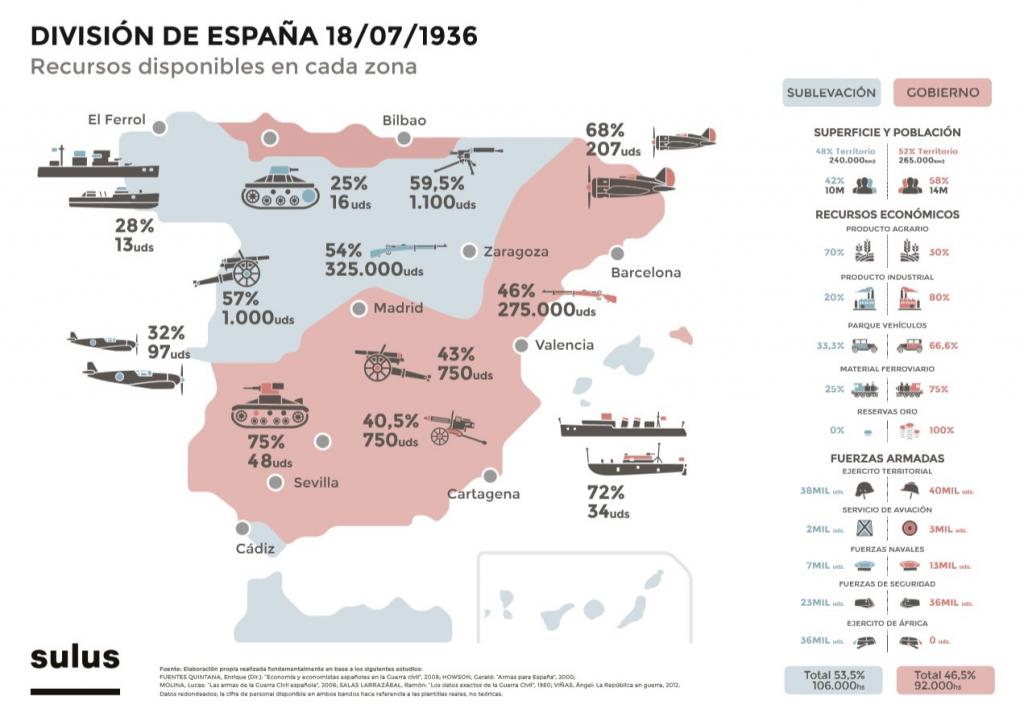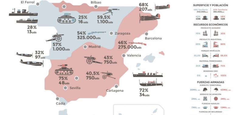 La fecha clave para el comienzo de la Guerra Civil fue el 19 de julio, cuando Franco se sumó al golpe militar. En ese momento, las fuerzas estaban muy equilibradas. “La población del sector republicano ascendía a algo menos de catorce millones de habitantes mientras que la de los sublevados sumaba algo más de diez millones. Según Fuentes Quintana, el gran estudioso de la economía en tiempos de la República y la guerra, el 80% de la industria estaba en manos republicanas, sin embargo, sólo tenían entre un 30 y 40 % del sector agrario. Además, los republicanos controlaban el 70% de la red férrea y del parque automovilístico”, enumera documentadamente.
