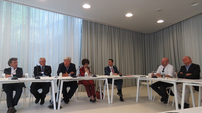 Santiago Herrero, director de programación de Acción Cultural Española (AC/E); Alejandro Tiana, Secretario de Estado de Educación y Formación Profesional; José García-Velasco, presidente de la Institución Libre de Enseñanza; Alicia Gómez-Navarro, directora de la Residencia de Estudiantes y Florentino Vivancos, presidente de la Fundación Estudio y a la derecha los comisarios de la exposición Eugenio Otero y Carlos Wert,