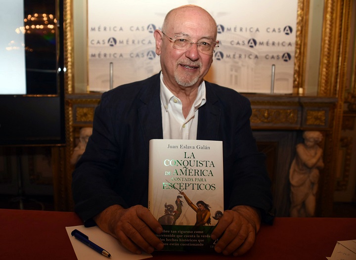 En el libro se habla de que a los indios se le trata como seres más atrasados. “Los españoles se casaron con ellas y tuvieron hijos con reconocimiento legal”, comentó Eslava Galán en la presentación ante el publico asistente a la sala. A lo largo de la historia de la conquista de América hay muchos mitos. El autor en el libro desmonta algunos de estos, como por ejemplo el de que no había sacrificios humanos, ni canibalismo y no se subyugaba unos pueblos a otros, Naturalmente es falso. El autor afirma que “la conquista al hicieron los indios y la independencia los españoles.