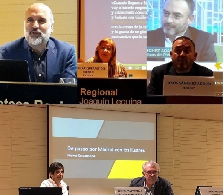 Escucharlos es abrir una ventana a la historia contada con amenidad. La primera lo demostró ante un público que abarrotó la sala de la Biblioteca Regional Joaquín Leguina ―incluso con gente esperando en la calle a que quedara alguna butaca libre― con una charla en la que puso en relación a personajes tan diversos como Galdós ―en puertas como estamos del centenario de la inauguración de su monumento en Madrid, y al que la Asociación Verde Viento homenajeará con varios encuentros, publicaciones y una sorpresa que, como miembro de dicha asociación, puedo contar que se desvelará no dentro de mucho―, Larra, José Zorrilla, Carmen de Burgos ‘Colombine’, o la que fue su pareja durante un tiempo, Ramón Gómez de la Serna; un recorrido por el Madrid de finales del siglo XIX y principios del XX trufado de casualidades, de lances del destino, y no exento de la crítica ácida y mordaz de la periodista madrileña, que fue recibido y alabado por el público presente tanto durante la charla como en el posterior turno de preguntas.