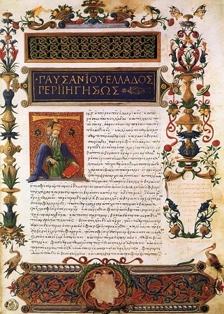 Portada iluminada de La descripción de Grecia, de Pausanias, del ejemplar de la Biblioteca de Florencia