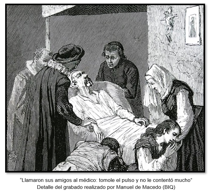 […] porque o ya fuese de la melancolía que le causaba el verse vencido o ya por la disposición del Cielo, que así lo ordenaba, se le arraigó una calentura que le tuvo seis días en la cama […] Llamaron sus amigos al médico: tomole el pulso y no le contentó mucho, y dijo que, por sí o por no, atendiese a la salud de su alma, porque la del cuerpo corría peligro. Oyolo don Quijote con ánimo sosegado, pero no lo oyeron así su ama, su sobrina y su escudero, los cuales comenzaron a llorar tiernamente, como si ya le tuvieran muerto delante. Fue el parecer del médico que melancolías y desabrimientos le acababan. (Q2, 74)
