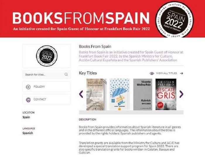 Según Elvira Marco, comisaria del proyecto de España en la Feria del Libro de Frankfurt, “a través de ‘Books from Spain’ se amplían enormemente las posibilidades de establecer contactos profesionales y de promocionar nuestra literatura. Este año, la Feria del alemana celebra una Edición Especial que combina programación física y virtual para reforzar al máximo las oportunidades de venta de derechos, por eso es muy importante contar con una plataforma digital que visibilice a nuestros autores, editores y agentes dentro del proyecto España Frankfurt 2022”.