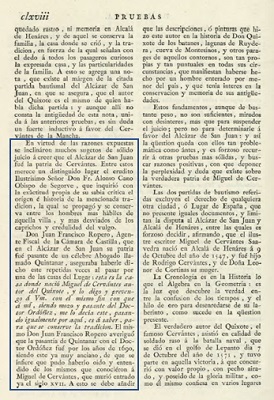 En el proemio a la edición de 1780 de la Real Academia Española, el académico y militar Vicente de los Ríos, Miembro de la Real Academia de la Historia y de la Real Academia Española en Madrid, cuando se refiere a la partida de bautismo existente en Alcázar de San Juan, dice que hay razones para creer que esta ciudad es la patria de Miguel de Cervantes por razones de peso como es la de que en ella aparece el apellido Saavedra (que no aparece en ningún miembro más de la familia de Alcalá) y también en el hecho de tener añadida una nota al margen en la que se asegura que el autor del Quijote es el mismo de quien habla dicha partida y que fue incorporado a ella de forma manuscrita por Blas de Nasarre, bibliotecario mayor del reino cuando la encontró en 1748.