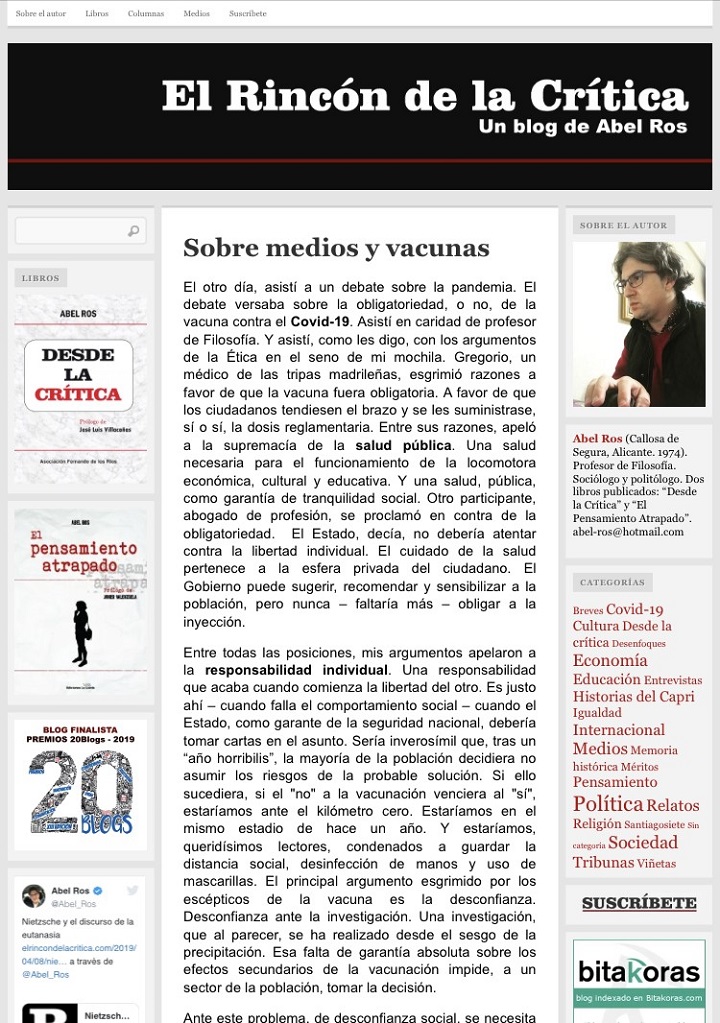 El autor del Rincón, Abel Ros, ha colaborado, como sociólogo, en distintos reportajes para El País y Uppers, entre otros. También como columnista, para Levante-EMV. El Rincón de la Crítica es una seria apuesta por el periodismo libre e independiente. Una apuesta que no pasa desapercibida para quienes buscan una alternativa a los medios tradicionales.