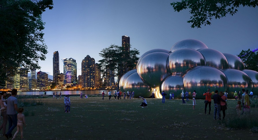 ‘Bounce by Circa’ transcurre en una carpa diseñada por el estudio AL_A. Un singular espacio en el que el exterior es una llamativa constelación de burbujas cromadas, una estructura inflable en forma de nube de 15 metros de altura y 30 metros de diámetro que refleja el entorno a su alrededor y el interior es un mundo de maravillas y deleites que acoge la nueva creación de la compañía australiana Circa Contemporary Circus.