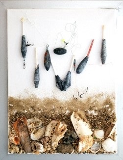 Una de sus pasiones es nadar y bucear, recoge plomos y anzuelos, guijarros o conchas… y conforma así el cuento que se plasma en estampas, en collages que recrean la ficción, son los cuadros marinos los que iluminan la escritura. Posiblemente tiene María una relación especial con ese mar que, en Portugal, la engulló cuando tenía 6 años pero que afortunadamente quedó solo en una pérdida de consciencia durante tres días emergiendo de nuevo, tal vez como sirena, como narra en su relato.