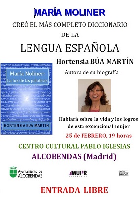 Hortensia Búa Martín, autora de la biografía: “María Moliner: la luz de las palabras”, y colaboradora de “todoliteratura.es”, con varios artículos sobre María Moliner, impartirá una conferencia el próximo, 25 de Febrero, a las 19 horas, en el Salón de Actos del Centro Cultural Pablo Iglesias, de Alcobendas (Paseo de la Chopera número 5). Entrada libre.