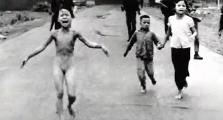 Lo más estremecedor de la fotografía no es tanto la niña, sino la indiferencia de los marines que caminan tras ella. La salvó el fotógrafo, un joven vietnamita llamado Nick Ut. En el hospital no querían atenderla, ya la daban por muerta.