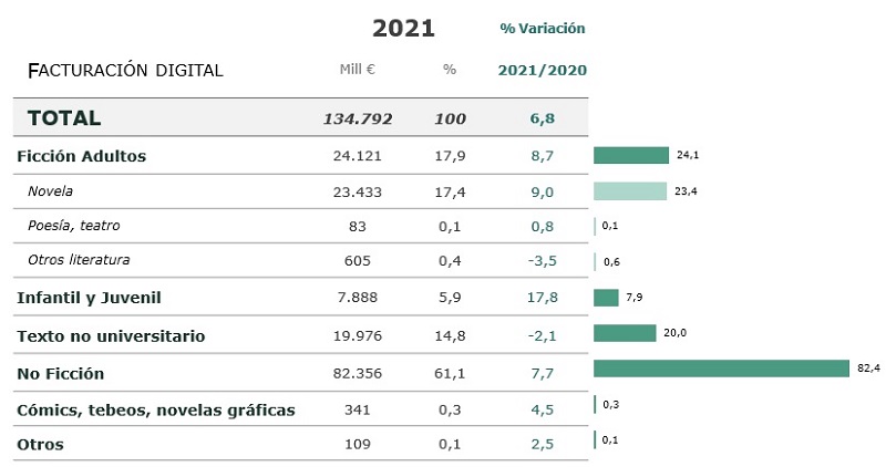 La edición digital supuso, en 2021, el 5,2% de la facturación total, llegando a los 134,79 millones de euros en ventas. Esto refleja un aumento del 6,8% con respecto al año anterior. El número de títulos editados también se incrementó ligeramente (+1,2%), con un total de 24.176 títulos, lo que supone seguir incrementando la oferta de títulos digitales, que se situó en los 186.887 títulos.