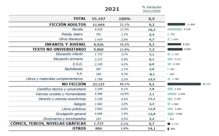 Un aspecto relevante que se desprende del informe es que las ventas subieron de forma general en todos los subsectores del libro, excepto en los libros de texto. El subsector que más creció en facturación fue el infantil y juvenil, que con un 17,8% por encima del año anterior alcanzó los 432,24 millones de euros, seguido por la ficción para adultos (+8,2%), con unas ventas de 548,90 millones de euros. Los libros de no ficción incrementaron sus ventas un +7,7%, hasta los 770,92 millones de euros. Por su parte, el subsector de cómics, tebeos y novelas gráficas creció en un 6,7% con respecto de 2020.