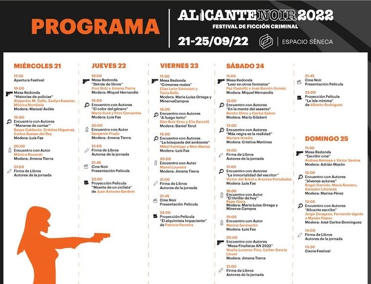 Las actividades de Alicante Noir tienen entrada libre y el público puede acudir directamente o reservar su plaza enviando su nombre, apellidos, número de teléfono y fecha al correo [email protected] indicando en el asunto “reserva de plaza”.