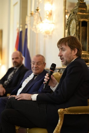 Éric Tallon, consejero de Cooperación y de Acción Cultural, Director General del Institut français de España tomó la palabra, detallando los grandes ejes de la programación de la Temporada cultural. y dijo que la programación había sido elaborada a partir de tres ambiciones para la relación franco-española en el ámbito cultural: trabajar juntos, ser creativos, actuar como europeos. Recordó que "estos eran los tres grandes objetivos que habíamos decidido atribuir a "Escenas francesas" cuando, a instancias del Embajador, habíamos decidido darle un nuevo aliento a nuestra Temporada Cultural." Destacó 3 orientaciones para este año: "participar en el debate de ideas en España y en el dinamismo de la escena intelectual española; profundizar nuestra cooperación en el ámbito cultural; promover los valores que tenemos en común." "Este año, presentaremos las reflexiones francesas contemporáneas durante la Noche de las Ideas en el Círculo de Bellas Artes, sobre el tema de la resiliencia colectiva, con personalidades destacadas como B. Stiegler y P. Claudel."