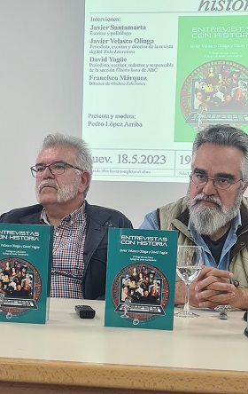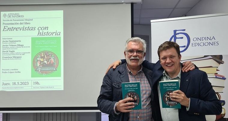 Periodistas ambos, de reconocido prestigio, con una buena mochila a sus espaldas que los avala como profesionales de la pluma, publican un libro curioso por lo novedoso: Entrevistas con historia, de Ondina Ediciones. Tras años de cháchara con escritores de distinto pelaje han comenzado por las que han realizado a autores que, basándose en hechos históricos, ficcionan sobre personajes que han tenido un papel importante en la vida de ciudadanos que nos precedieron. Son 60 las entrevistas incluidas, tanto de escritores nacionales como internacionales. El jueves, 18 de mayo, presentaron su libro escrito por cuatro manos sin fricciones en la sala Larra del Ateneo de Madrid, acompañados por el editor y director de Ondina Ediciones, Francisco Márquez, el escritor y politólogo -autor del epílogo del libro, Javier Santamarta y del director de la Biblioteca del Ateneo, Pedro López Arriba.