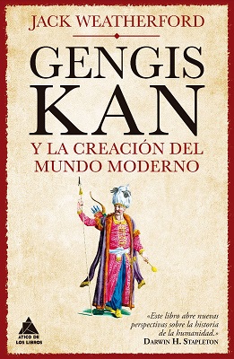 Estamos ante otra obra estupenda de la editora 'Ático de los Libros', sobre un personaje esencial en el final del Medioevo, que creó uno de los mayores imperios de la Historia. El prof. Weatherford es un narrador muy encomiable y destacado. «La biografía definitiva del fundador del imperio más grande de la historia. En veinticinco años, Gengis Kan y sus ejércitos mongoles conquistaron más que los romanos en cuatro siglos, y fundaron el imperio más extenso que el ser humano ha visto nunca. Nacido Temuyín, un paria de las estepas, el hombre destinado a hacer historia como Gran Kan de los mongoles conquistó todos los territorios sobre los que posó la vista: desde Georgia y Armenia hasta Corea. Gengis Kan se erigió como un líder inesperadamente moderno: abolió las torturas, garantizó la libertad religiosa y destruyó los sistemas feudales basados en el privilegio aristocrático. Cuando nació, con un coágulo de sangre en la mano, su madre predijo que aquel niño cambiaría el rumbo del mundo, y así fue: Gengis Kan unificó a todas las tribus mongolas de las estepas y transformó su modo de vida; creó el ejército más eficaz del medievo, abrió rutas comerciales que conectaron el mundo conocido y fundó un imperio que se extendía desde Europa hasta Asia oriental. Sus sucesores fueron reyes, kanes y emperadores en China, India y Rusia, y su legado fue imperecedero. Desde los inicios de la vida de Gengis Kan y su ascenso y transformación del mundo tribal de las estepas hasta la explosión civilizadora del Imperio mongol, este brillante ensayo de Jack Weatherford, antropólogo especialista en historia mongola, nos cuenta la épica historia de cómo se forjó el mundo moderno». Los mongoles, el pueblo de Gengis Kan, han padecido todo tipo de vicisitudes y de genocidios; concretamente entre 1937 y 1939, el stalinismo criminal envió a sus comisarios para exterminar al mayor número de mongoles, el cómplice necesario sería Khorlooglin Choibalsan, por lo que la población se redujo en un 5%, en esta represión también cayeron los monjes y monjas budistas, en un número no inferior a 16.000 religiosos. Gengis Kan poseía, para identificarse frente a sus gentes, dos estandartes, el primero con crines de caballo blanco para los tiempos de paz, y, como solía ser de rigor, de crines de caballo negro para los tiempos de guerra. Su entorno familiar fue desastroso, ya que creció en un territorio, típicamente de la cultura socio-política de los mongoles, de una enorme violencia entre las diversas tribus, que se caracterizaría por los múltiples asesinatos, secuestros entre grupos, y la consiguiente esclavización de las personas. "Como hijo de una familia proscrita, abandonada a su suerte en las estepas, probablemente apenas llegará a encontrarse con unos pocos cientos de personas en toda su infancia, y no recibió ningún tipo de instrucción en el sentido literal de la palabra. De este duro entorno aprendió, con todo tipo de detalles escabrosos, a conocer las emociones humanas: el deseo, la ambición y la crueldad. Siendo todavía niño, mató a su medio hermano mayor, fue capturado y esclavizado por un clan rival y consiguió escapar de sus captores". Desde el punto de vista psicológico, y al ser tan pequeño y tan maltratado por su medio natural, se le incrementaría su instinto de supervivencia y de conservación; aunque esto no dejaba de ser más que un modus vivendi, pero, así de este modo y manera, su carácter se fue modelando, para poder hacer frente al futuro, qué con este presente, no se anunciaba muy boyante. Siempre tuvo una doble capacidad, paradójica, que fue la de irse creando amigos y enemigos a la par. Año tras año fue incrementando su poder, utilizando o creando alianzas a su conveniencia. Cuando llega a la cincuentena, ya estaba en condiciones de enfrentarse a aquellos pueblos, que considerados civilizados, siempre habían perseguido y esclavizado a las tribus nómadas, a las que despreciaban y humillaban, en grado superlativo. Tras ir conquistando tierras y pueblos unos tras otros, se vio obligado a mutar su forma de combatir, el centro de su desarrollo militar sería su caballería y esta, muy disciplinada. "En vez de confiar en fortificaciones defensivas, hizo un uso brillante de la velocidad y la sorpresa en el campo de batalla, además de perfeccionar las técnicas de asedio hasta el punto, que logró poner fin a la época de las ciudades amuralladas. Gengis Kan enseñó a su pueblo no solo a luchar a través de grandes distancias, sino también a mantener sus campañas militares durante años, décadas e incluso, llegado el caso, durante más de tres generaciones de combate constante". Sus conquistas abarcaron a buena parte de las civilizaciones, del momento histórico en que le correspondió vivir. Cuando su Imperio mongol llegó a su culmen máximo, ya abarcaba la friolera de un territorio de entre diecisiete y diecinueve millones de kilómetros cuadrados. En la nacencia de su Imperio, en el año 1162, su esfuerzo bélico había conseguido conectar, social y políticamente, a la Vieja Europa con la China de más rancio abolengo. El imperio creado por Gengis Kan seguiría creciendo durante otros ciento cincuenta años más. Sus descendientes siguieron ostentando títulos, pero que ahora ya eran los de kan, emperador, sultán, rey, sah, emir y dalái lama. Gran parte de los grandes conquistadores de la Historia, hasta llegar a Gengis Kan, tuvieron un final trágico, desde Jerjes I, hasta Alejandro III Magno, pasando por Gayo Julio César, Aníbal Barca "el Grande", Pirro I "el Grande", etc., mientras que el Gran Kan de los mongoles pasó a mejor vida, casi con los 70 años cumplidos, acostado en su propia cama, dentro de su tienda de campaña, y rodeado del respeto, afecto y veneración, de su familia, de sus más leales amigos y de sus fidelísimos soldados; todos ellos dispuestos, en toda ocasión, a dar su vida por la de él. Aunque se real
