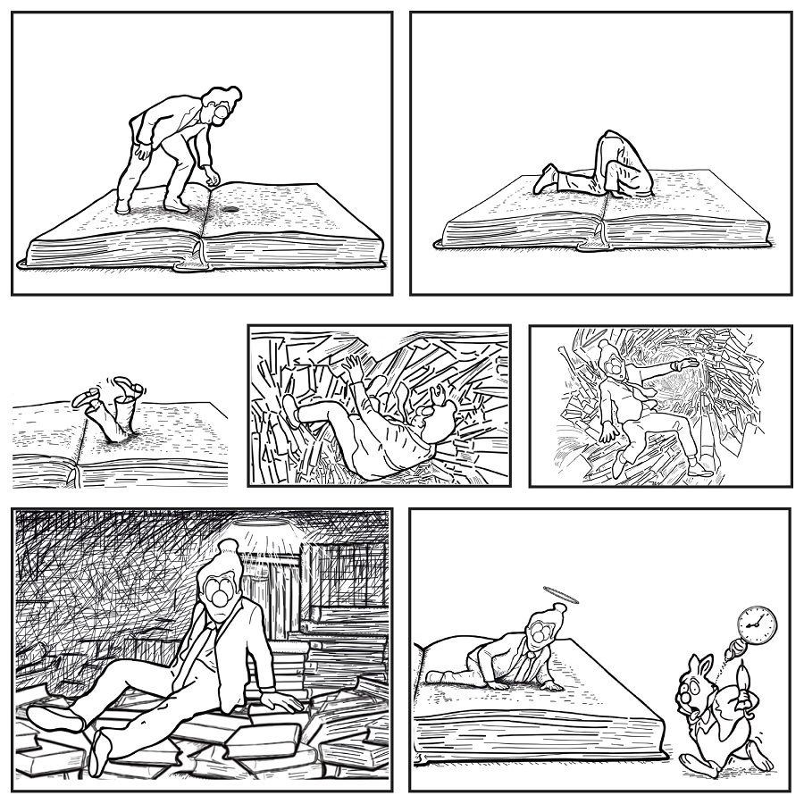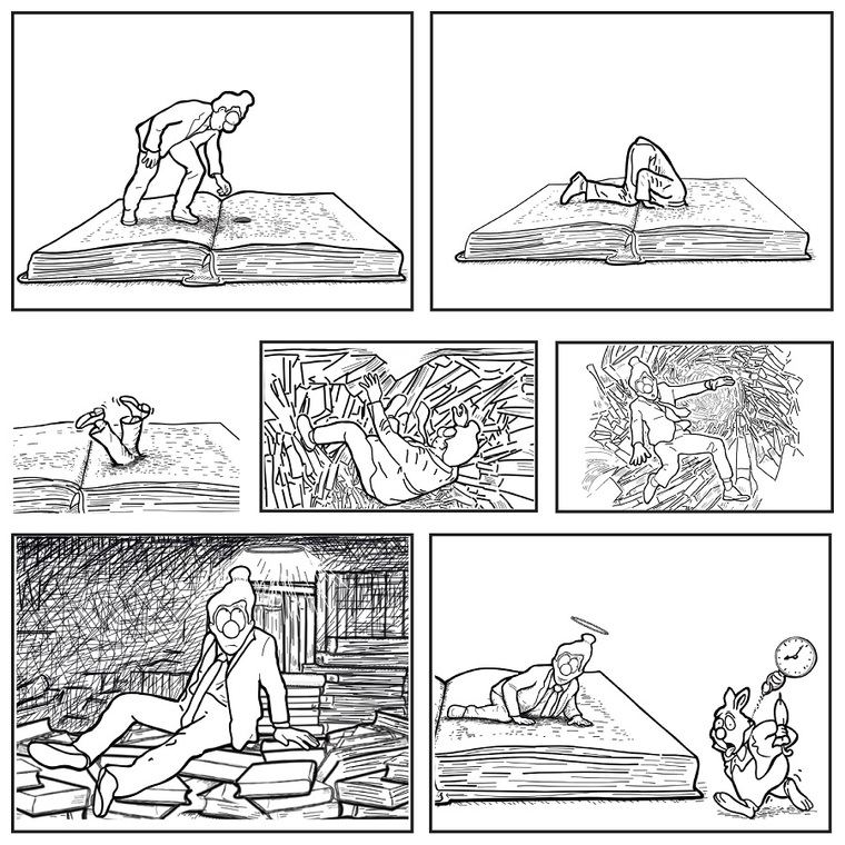 Alicia en el país de los libros. No es Alicia, pero el protagonista nos recuerda a ella. Y más, cuando se cae por un agujero de un libro.