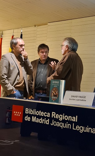 - Voy prudente y con pies de plomo. A él le tocó presentar a David, admitiendo que son a la vez rivales y amigos. ¡Cómo se reía el joio! Sólo rivales periodísticos, aclaro, que se miran de reojo y si tiene una exclusiva se la guarda para que no se entere. David, además de periodista es también escritor de novela histórica y juntos han hecho muchas cosas -como el libro antes mencionado y que no voy a dar más publicidad porque todo el mundo habla de él-, como Certámenes de Novela Histórica, entrevistas, viajes de prensa de presentaciones de novela histórica… Contó también que Yagüe ha dado un salto de 20 minutos al ABC, por lo que ha tenido que dejar su blog con el consiguiente regocijo de Javier que se ha quedado sin competencia.