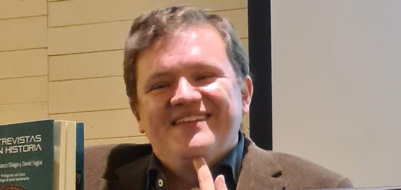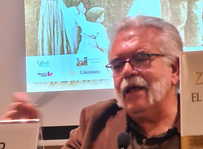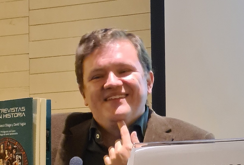 - Sí, tía, vamos con el final, con la estrella, es decir, con Luis Zueco. Oliaga habla de las peculiaridades de sus obras, como son que los protagonistas no son los grandes de la historia, por una vez, sino personas secundarias con una vida cotidiana, que tiene sentimientos… nos acerca la historia desde esos personajes, más humanos que los de otros novelistas históricos.