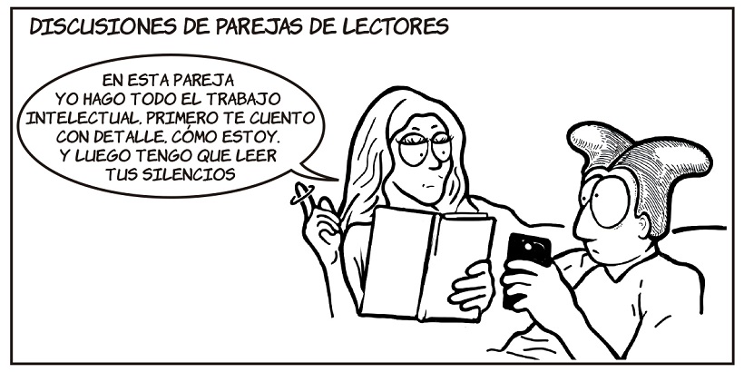 Discusiones de parejas de lectores son frecuentes y más cuando no se escuchan. Uno de estos lectores le dice al otro: en esta pareja yo hago todo el trabajo intelectual. Primero te cuento con detalle como estoy y luego tengo que leer tus silencios.