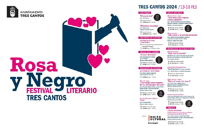 Durante seis jornadas que se desarrollarán en torno a los fastos del Día de los Enamorados, el Ayuntamiento de Tres Cantos celebrará la primera edición de Rosa & Negro con la dirección de la escritora y periodista Marta Robles. El festival será pionero en acercar la literatura romántica y la negrocriminal y descubrir a través de charlas transversales entre reconocidos autores de uno y otro género sus puntos de encuentro y desencuentro en la concepción y el desarrollo de sus obras. Se trata de una decidida apuesta por la cultura desde la más atrevida y atractiva diversidad destinada tanto al público juvenil como al adulto, que se desarrollará en los principales escenarios destinados a ella en el municipio como son la Biblioteca Lope de Vega (Avenida de los labradores, 28), el Teatro del Centro Cultural (Plaza del Ayuntamiento, 2) y Factoría Cultural (centro 21 de marzo, Plaza de la Estación, 2). Se sumará como espacio exclusivo el campus de la escuela universitaria The Core School (a la que podrá asistir público externo), y se ha lanzado la invitación a participar a distintos institutos de la localidad, que son, al igual que la propia universidad, centros estratégicos desde donde empezar a trabajar el fomento de la lectura en jóvenes y adolescentes.