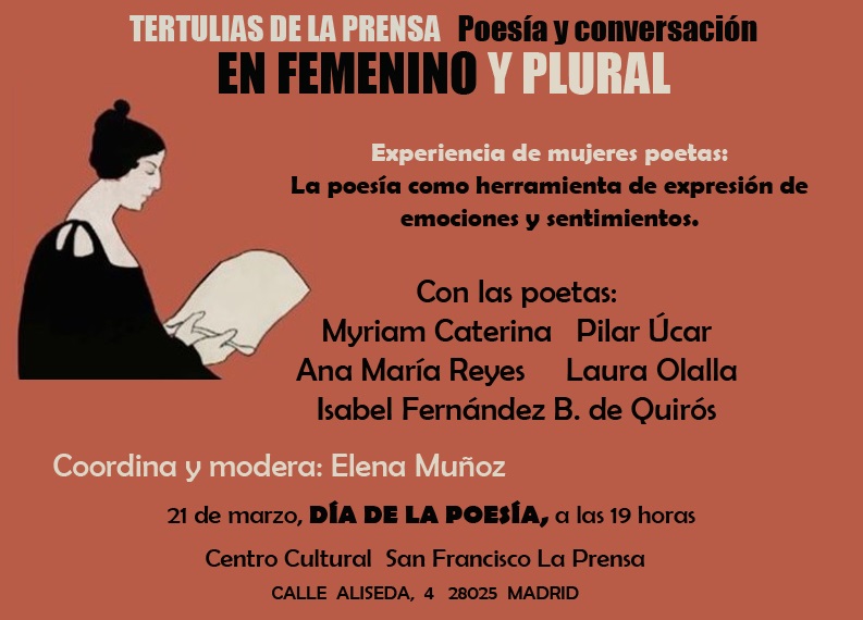 En esta línea y bajo el título EN FEMENINO Y PLURAL se presenta el acto que tendrá lugar el próximo día 21 de marzo en el Centro cultural San Francisco La Prensa (19h), en el madrileño barrio de Carabanchel, y en el que se aúna la celebración de Marzo mujer y el Día de la poesía.
