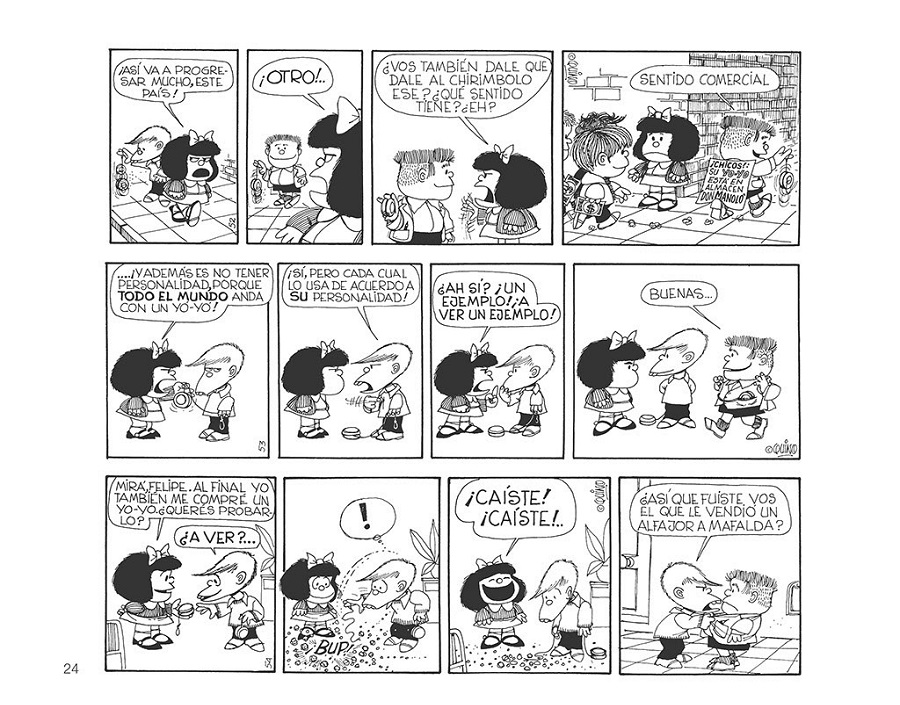 Como dijo el Premio Nobel Gabriel García Márquez, Quino nos demostró con cada uno de sus libros “que los niños son los depositarios de la sabiduría. Lo malo para el mundo es que a medida que crecen van perdiendo el uso de la razón, se les olvida en la escuela lo que sabían al nacer, se casan sin amor, trabajan por dinero, se cepillan los dientes, se cortan las uñas, y al final, convertidos en adultos miserables, no se ahogan en un vaso de agua sino en un plato de sopa. Comprobar esto en cada libro de Quino es lo que más se parece a la felicidad: la quinoterapia”.