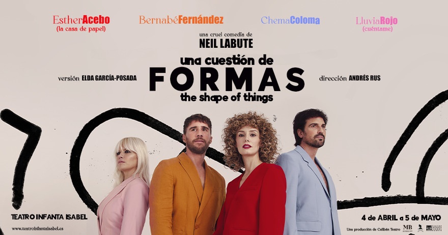 Una cuestión de formas nos ofrece un mundo en ruinas arrebatado por el doble sentido de las palabras que muchas veces utilizan los actores como una forma de reivindicar la doblez que exige el engaño, pero también la huida del miedo, pues de alguna forma Adam, Evelyn, Jenny y Philip huyen de sí mismos, y de ahí la prevalencia de la mentira sobre el amor o la amistad. Sus vidas están marcadas por el fracaso que se resume en sus mediocres trabajos, la residencia en una pequeña y aburrida ciudad, y la falta de unos objetivos que ellos visualizan en las apariencias. Esa existencia basada en una cuestión de formas que por arte del azar podrían ser otras, y estar muy alejadas de los cambios de comportamiento o estéticos que realizamos por tratar de agradar al otro. Ese ser uno mismo a través del otro es uno de los espejos ciegos que se traducen de esta obra en la que cabe destacar el papel de Esther Acebo como Evelyn, pues aparte de ser el eje sobre el que gira la obra hace del arte de la improvisación y la interacción con el público un ejercicio de naturalidad y cercanía que pocas veces se aprecian sobre el escenario, lo que para nada contrarresta su papel de fría y calculadora femme manipuladora. Magnífica, sin duda. Del mismo modo que Bernabé Fernández como Adam da vida a un personaje lleno de miedos y frustraciones que buscan una salida airosa a su propia tragedia.