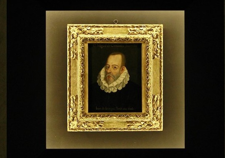 Éste que veis aquí, de rostro aguileño, de cabello castaño, frente lisa y desembarazada, de alegres ojos y de nariz corva, aunque bien proporcionada; las barbas de plata, que no ha veinte años que fueron de oro, los bigotes grandes, la boca pequeña, los dientes ni menudos ni crecidos, porque no tiene sino seis, y ésos mal acondicionados y peor puestos, porque no tienen correspondencia los unos con los otros; el cuerpo entre dos estremos, ni grande, ni pequeño, la color viva, antes blanca que morena; algo cargado de espaldas, y no muy ligero de pies; éste digo que es el rostro del autor de La Galatea y de Don Quijote de la Mancha, y del que hizo el Viaje del Parnaso, a imitación del de César Caporal Perusino, y otras obras que andan por ahí descarriadas y, quizá, sin el nombre de su dueño. Llámase comúnmente Miguel de Cervantes Saavedra. Fue soldado muchos años, y cinco y medio cautivo, donde aprendió a tener paciencia en las adversidades. Perdió en la batalla naval de Lepanto la mano izquierda de un arcabuzazo, herida que, aunque parece fea, él la tiene por hermosa, por haberla cobrado en la más memorable y alta ocasión que vieron los pasados siglos, ni esperan ver los venideros, militando debajo de las vencedoras banderas del hijo del rayo de la guerra, Carlo Quinto, de felice memoria. [1]