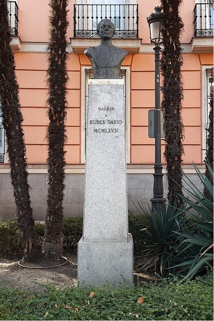 Félix Rubén García Sarmiento (Rubén Darío) (1867-1916). Monumento dedicado a Rubén Darío, busto obra del escultor José Planes Peñalver, inaugurada en 1967. El monumento está ubicado en la Glorieta de Rubén Darío de Madrid