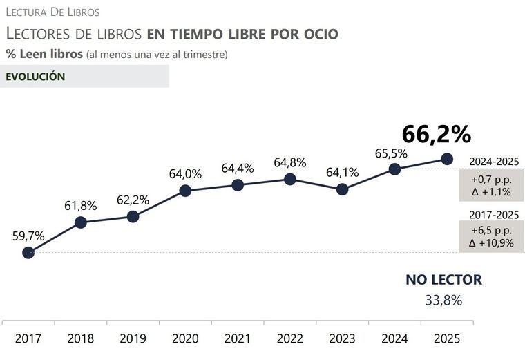 El Barómetro 2025 confirma también la evolución al alza de la compra de libros no son de texto. En el último año, el 54,1 % de la población compró algún libro de estas características, 6,8 puntos más que en 2017.