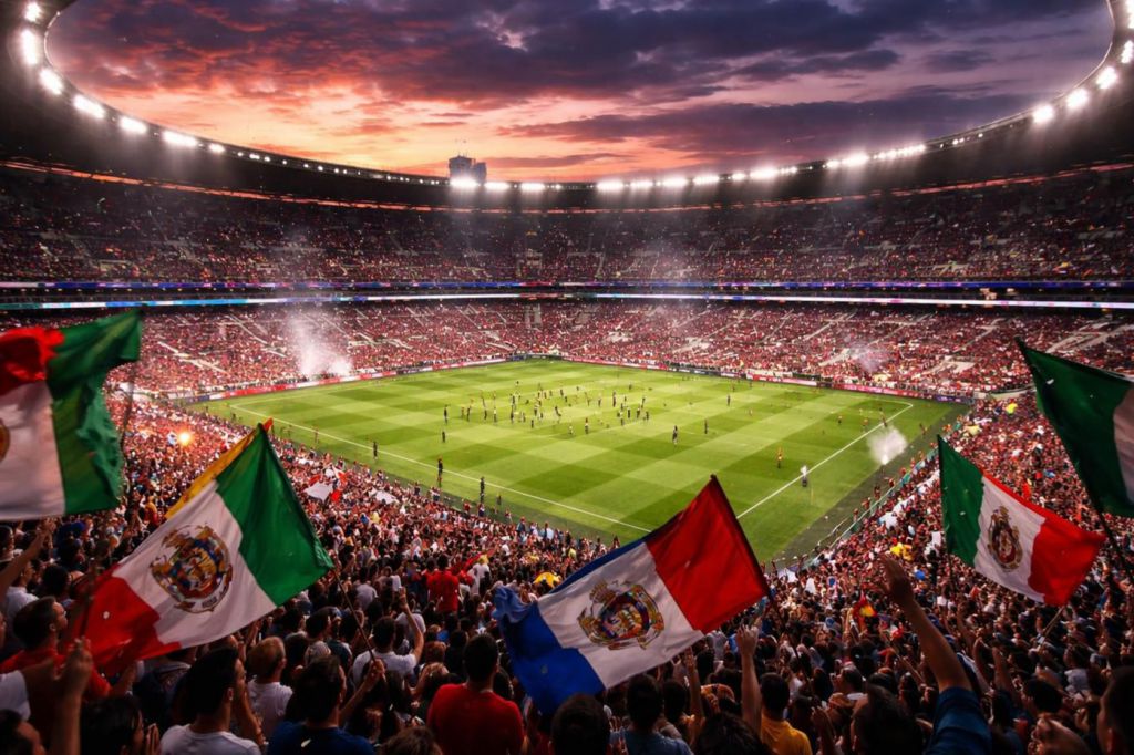 Estadio de la Liga MX repleto de aficionados con banderas (Foto: Cibeles AI)