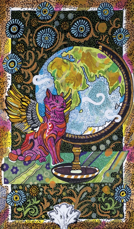 Con todo, el poeta y dramaturgo ruso también acabaría pegándose un tiro. La condición humana repleta de paradojas y contradicciones, un pozo amargo y a la vez insurgente que nos debe hacer reflexionar no solo sobre la condición humana, también sobre la cordura y la locura, la lucidez y el disparate. Percibimos lo perturbador y lo inquietante en ese proceso de aprendizaje que a veces colapsa, la descripción emocional de seres que evolucionan con silencios, sufrimientos, desesperaciones, una suerte de análisis sociológico cinestésico, contrastando lo habitual con lo inusitad, lo usual con lo inhabitual, pero por fortuna, están las piedras humanizadas que permiten lecturas fascinantes. Un pensamiento que se enfatiza con las imágenes de Blas (Blas Toro Martín). De entrada, con una magnífica portada que presenta un estilo visual tan altamente decorativo como detallada y, que mediante el uso de colores vibrantes y contrastantes, especialmente el azul intenso y el rojo, con la figura del felino en un ornamentado marco parece querer centrar su simbolismo en lo estético visual para reforzar lo ético predominante del relato. Otras ilustraciones esenciales son las referidas a “la mona” que oscila desde los simétricos diseños florales hasta el colorido vivo, quizá reminiscente de ciertas tendencias de arte folclórico y diseños textiles, buscando si acaso, un significado no tanto de exactitud como de universalidad. Así, por ejemplo, la obra que representa un gorila rodeado de números y palabras en español tiene la fuerza del colorido, la persuasión de lo distintivo o publicitario. En cualquier caso, la recurrencia estilística es tan variada como acertada, el arte pop, estilo naíf, la perspectiva imaginativa, el neoexpresionismo, inclusive esa forma de creación espontánea y original conocida como el arte outsider, caracterizan la aventura pictórica de Blas con una presencia humana determinante. Ambos, el narrador y el ilustrador exploran mundos donde la necesidad de transgredir convenciones, detallar para alinear conceptos o delinear figuras nos llevan a ese doble plano del arte que asume lo estético y lo ético. La tercera vía es el canto, y en ese espacio el narrador y el ilustrador construyen un marco emocionante que postula desde luego el trabajo como fuente de inspiración. Todo un fluir de creatividad en ese río de sucesos, formas, lógicas y analogías. Jesús Herrán Ceballos en la presentación de Gabriel Rodríguez acierta de pleno: “Lleva una vida dedicada al arte, la creatividad y el pensamiento, sin estridencias, pero con una hondura que deja huella”. No le va a la zaga, Javier Lara que, a propósito de Blas Toro, nos escribe: “En mis cristales habita el reflejo de un hombre que nunca dejó de ser niño, que siguió recortando el mundo con amor y devoción”.