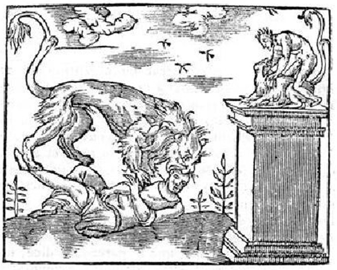 Los antecedentes en Esopo. El Hombre y el León. Un hombre y un león viajaban juntos, llegaron á un lugar donde vieron una estatua de piedra que representaba un atleta ó á Hércules cuando desquijaraba á un león. Esto que tú ves, dijo el hombre al leon su compañero, prueba que los hombres somos mas fuertes y mas valerosos que vosotros los leones. Respondió el león: si entre nosotros se hallasen escultores, como los hay entre vosotros, verías muchos mas hombres despedazados por los leones, que leones muertos por los hombres. Muchas historias vemos pintadas que no son verdaderas; pues hay hombres que con solo coger un pincel tierno, harán en está vida, que sea cielo el mismo infierno.