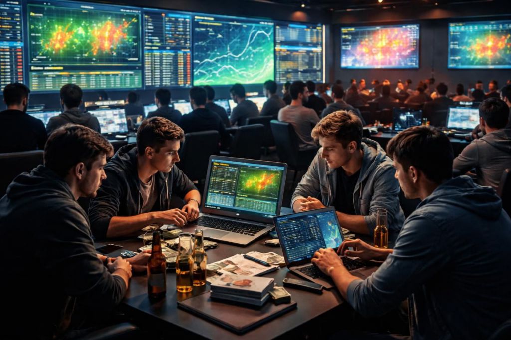 Apostadores analizan gráficos en una sala de apuestas moderna en 2026, discutiendo estrategias en grupo.