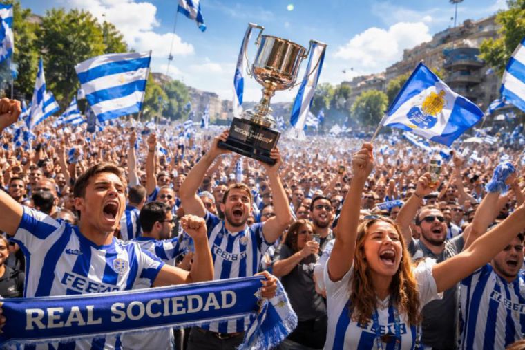 Multitud celebra la victoria de la Real Sociedad en la Copa del Rey contra el Atlético de Madrid, con banderas. (Foto: Imagen generada por inteligencia artificial – Cibeles AI)