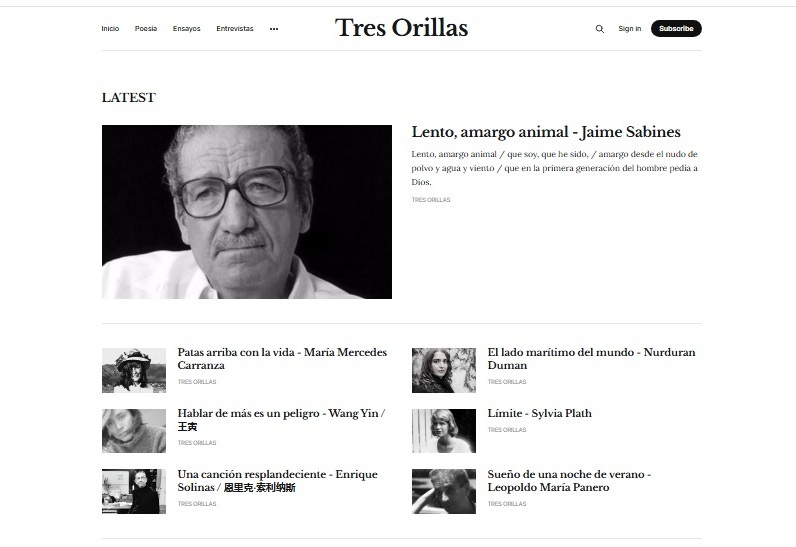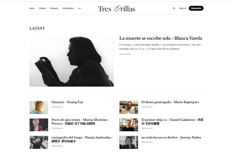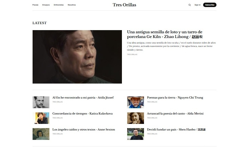 Se accede a ella en www.tresorillas.com. La idea es, como siempre, publicar lo mejor de la poesía latinoamericana y universal, sin descuidar por supuesto el encuentro necesario y vital con los nuevos creadores. Está enfocada principalmente sobre aquellas lenguas que tienen más hablantes, es decir, el chino, el inglés y el español. Por eso la sección Tres lenguas es como la más visible. Cada 10 días aparecen ocho nuevos autores de distintas partes del mundo. Publicamos un post diario de lunes a viernes, que las redes sociales, principalmente Facebook e Instagram, ayudan a multiplicar. La revista cuenta con diversas secciones como la ya citada Poesía en Tres Lenguas, Poesía Latinoamericana, Poesía Inglesa, Poesía China, Poesía Universal, Poesía Española, Entrevistas, Ensayos, Poetas, Nosotros, Sitios Amigos, y otras interesantes secciones que irán apareciendo con el correr de los días.