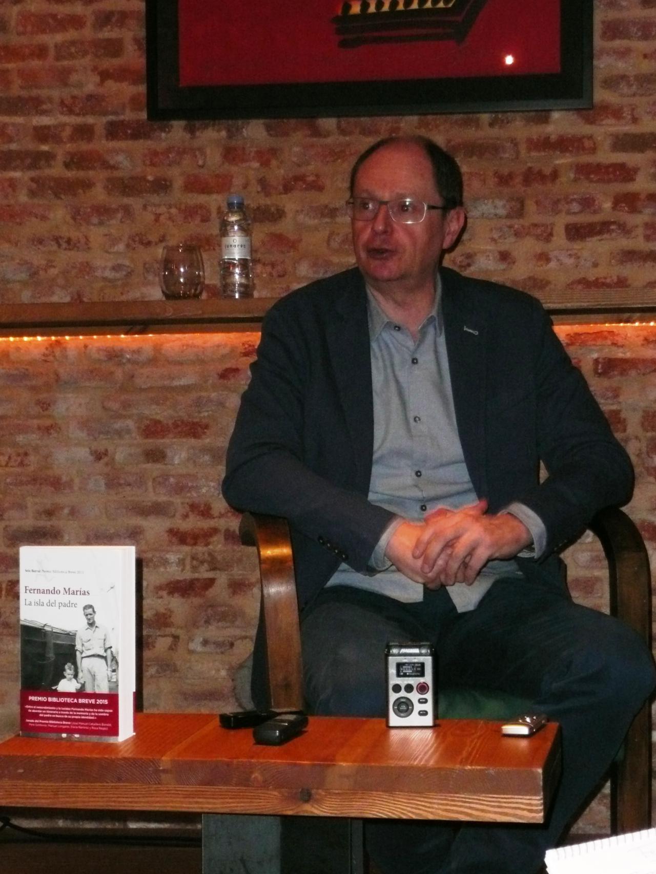 En febrero de 2009 el padre de Fernando Marías, un viejo marino mercante, fue operado a vida o muerte de una grave enfermedad. Tan sólo le pronosticaron una esperanza de vida de año y algo, pero se alargaría hasta algo más de cuatro años, hasta junio de 2013, en que de repente dejó de reconocer y de ver; la enfermedad había entrado en fase tan extrema que le impidió hablar el día previo a su fallecimiento, le impidió despedirse verbalmente. De ahí que esa palabra que su padre no pronunció sea este libro. Desde que su progenitor enfermó Marías comenzó a tomar notas mentales, no por escrito. El criterio de selección para utilizarlas en este libro fue sencillo: incluir aquellas que volvieran dos veces a su memoria. La historia se remonta a 1913, año en que su abuela alquila la casa familiar, en la que nacieron su madre y sus tíos, él y sus hermanos, y si no físicamente ya allí, sí emocionalmente, sus sobrinos. Ocurrió un hecho sorprendente cuando la vendieron tras la muerte de su padre: el comprador le ofreció esperar a que acabara tranquilamente el libro antes de ocupar la casa, algo decisivo para esta novela. El libro se va componiendo sobre una mesa llena de anotaciones, ubicada en la habitación en que escribía desde niño y en la que soñaba con ser director de cine. Entre los simbolismos vitales cotidianos Fernando Marías destacó uno: esa bombilla que se funde y que, puesto que en esa casa ya no vive nadie, resulta absurdo cambiar. Y a continuación de suceder ese hecho, cerró el ordenador, cerró el secreter sobre el que estaba escribiendo y, por último, cerró la puerta como si fuera de nuevo el momento en que su abuela compró la casa: un instante circular, cíclico, en que se concluye una historia iniciada un siglo antes. Un episodio ocurrido en la infancia de Fernando Marías que resultó decisivo en su vida, resaltada tal importancia por su psicoanalista al señalarle que el mero hecho de recordarlo toda su vida ya es prueba de ello, fue la aparición de su padre en el ático de Bilbao en que vivía bajo el cuidado en exclusiva de su madre y su abuela. El diálogo que marcaría para siempre a Fernando y que traumatizó a su padre de por vida fue el siguiente: — MADRE: Es Papá. — FERNANDO: ¿Y se va a quedar? Su padre no esperaba un recibimiento tan frío, tan inadecuado por parte de su hijo, lo que le obligó a tener que ganárselo, cosa que hizo a través de contarle historias de aventuras, mientras subían y bajaban el Monte Pagasarri. “El cine en una ciudad gris me salvó la vida”, nos dice Fernando justo antes de rememorar que estudió en un colegio de curas, durante un tiempo de desesperanza cuando él ni sabía que existiera tal sentimiento vital. Ello explica por qué esta obra habla mucho de cine. La isla del padre es tan personal que es el mejor libro que ha hecho, en el que más libre se ha sentido, lo que genera la siguiente duda: ¿Hay un retorno después de haber atravesado esa frontera?, pregunta ante la que casi se impone una respuesta negativa, pues Fernando Marías duda si puede volver atrás tras sentirse tan libre después de haber roto todas las reglas. Este libro es un streaptease: se ha sentido como un profesional de su cuerpo, parte de una profesionalidad absoluta. Tras diez años psicoanalizándose, publica este libro en el que planea el deseo de contar todo aquello de lo que deseaba hablar, de ahí que se haya propuesto ser completamente sincero: “es un libro que es la verdad”. Toda obra necesita reposar y agradece un punto de vista externo para ser mejorada: esto último fue precisamente lo que le sucedió a Marías cuando estaba a punto de estancarse porque la novela estaba en un orden que no le convencía. Fue entonces cuando quedó con un conocido suyo que le preguntó qué estaba escribiendo y, tras contárselo, éste le sugirió que lo contara en una línea recta en la que la fluidez del relato impondría cuándo habría que incluir saltos en el tiempo. Seguido este acertado consejo, la novela cobró la forma que realmente le correspondía. Fernando Marías salió de Bilbao y fue a Madrid en busca de aventuras, porque no hay que ser un joven ballenero en busca de una ballena blanca para ir en busca de aventuras. Fue precisamente la narración de la aventura la que generaría la fluidez que le estaba solicitando su obra, que así llegó al punto de cocción justo porque el libro ya se podía resumir en línea y media. Su padre era un personaje oscuro, pero no tenebroso, con una rareza que a Fernando le costó comprender hasta que la experimentó por sí mismo: iba él solo a pasear por la ciudad cuando atracaban en un puerto, por ejemplo por Buenos Aires o Nueva York, observando la urbe mientras comía una hamburguesa. Este libro supone darle una vida añadida a su padre, prolongar su memoria, como si siguiera de manera extrema la máxima de que toda persona fallecida permanecerá viva mientras una persona que la quisiera la recuerde. La foto de portada fue hecha por su madre cuando padre e hijo vivían esa etapa de miedo mutuo tan decisivo en ese medio siglo de vida vivida que se nos va a narrar en esta obra, repleta de recuerdos que importan, los que se han quedado en la memoria y que determinan la vida posterior. Fernando Marías recordó a modo de ejemplo un suceso vital que le marcó según su psicoanalista: su padre estaba enfadado y Fernando pensó que no querría ir al cine, pero resulta que sí fueron, a ver una película de romanos mala, y al acabar su padre pronunció esta frase demoledora: “No vale ni el negativo en que fue filmada”. El hecho de que recuerde la frase exacta es la prueba de cuánto le marcó. También han resultado decisivos en su vida películas y libros. Dos ejemplos significativos son la película Soldado azul, que provocó su enamoramiento platónico de Candice Bergen, actriz que entonces tenía veintiséis años, doce más que él, y el libro Los cañones de Navarone en 