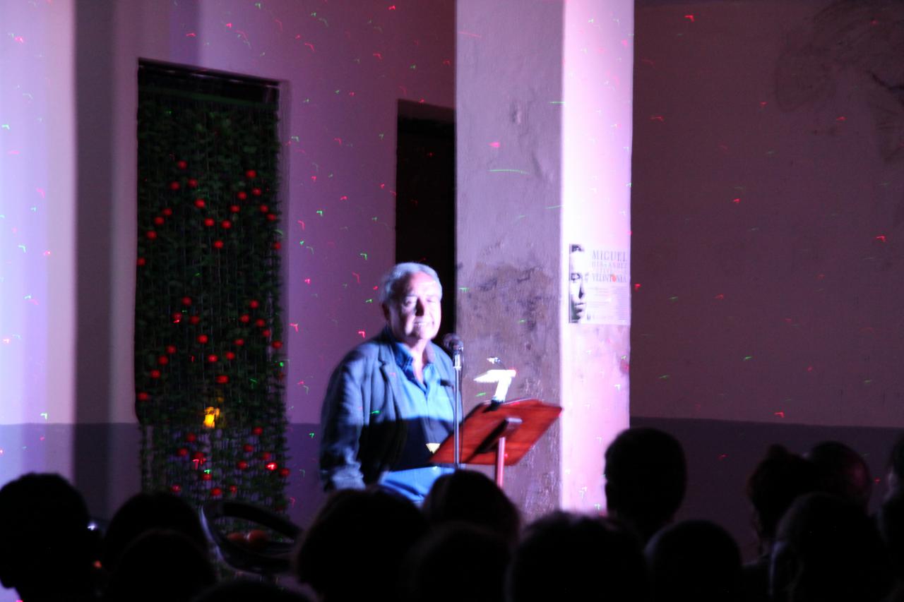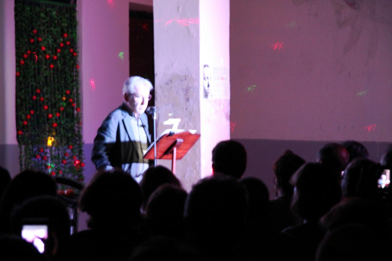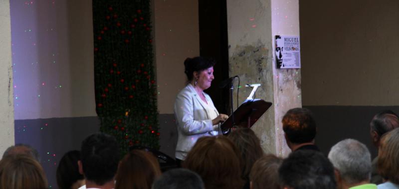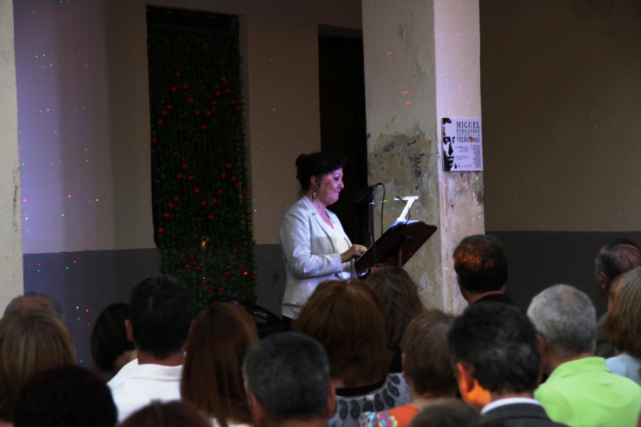 Alejandro Sanz, ojo no el conocido cantante, sino el presidente de la Asociación de Amigos de Vicente Aleixandre, ofició de maestro de ceremonias del evento. Con la voz del poeta sevillano hablando sobre Miguel Hernández comenzó una noche llena de poesía y recuerdos emocionados. Antes en la entrada nos obsequiaron con una naranja. Miguel Hernández visitaba a Vicente Aleixandre, cuando estaba postrado en el lecho del dolor durante la Guerra Civil, con un saco de naranjas que le ayudaban a su recuperación. Algo que nunca olvidó el poeta. Esa generosidad fue correspondida cuando Hernández estuvo preso y después a su muerte, siguió ayudando económicamente a su mujer Josefina Manresa con giros periódicos, aliviando así su difícil situación económica.