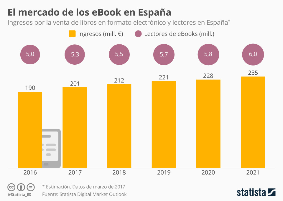 Desde el año 2010 en el que en España se alcanzó la cifra récord de 114.459 libros editados su número no ha dejado de disminuir. Como muestra esta infografía de Statista, esta cifra se situó en 79.397 títulos producidos en 2015, de los cuales 22.280 fueron en formato electrónico, es decir, un 28%, según el Ministerio de Educación, Cultura y Deporte.